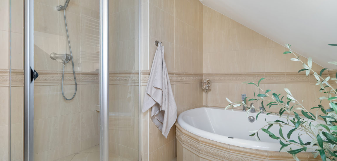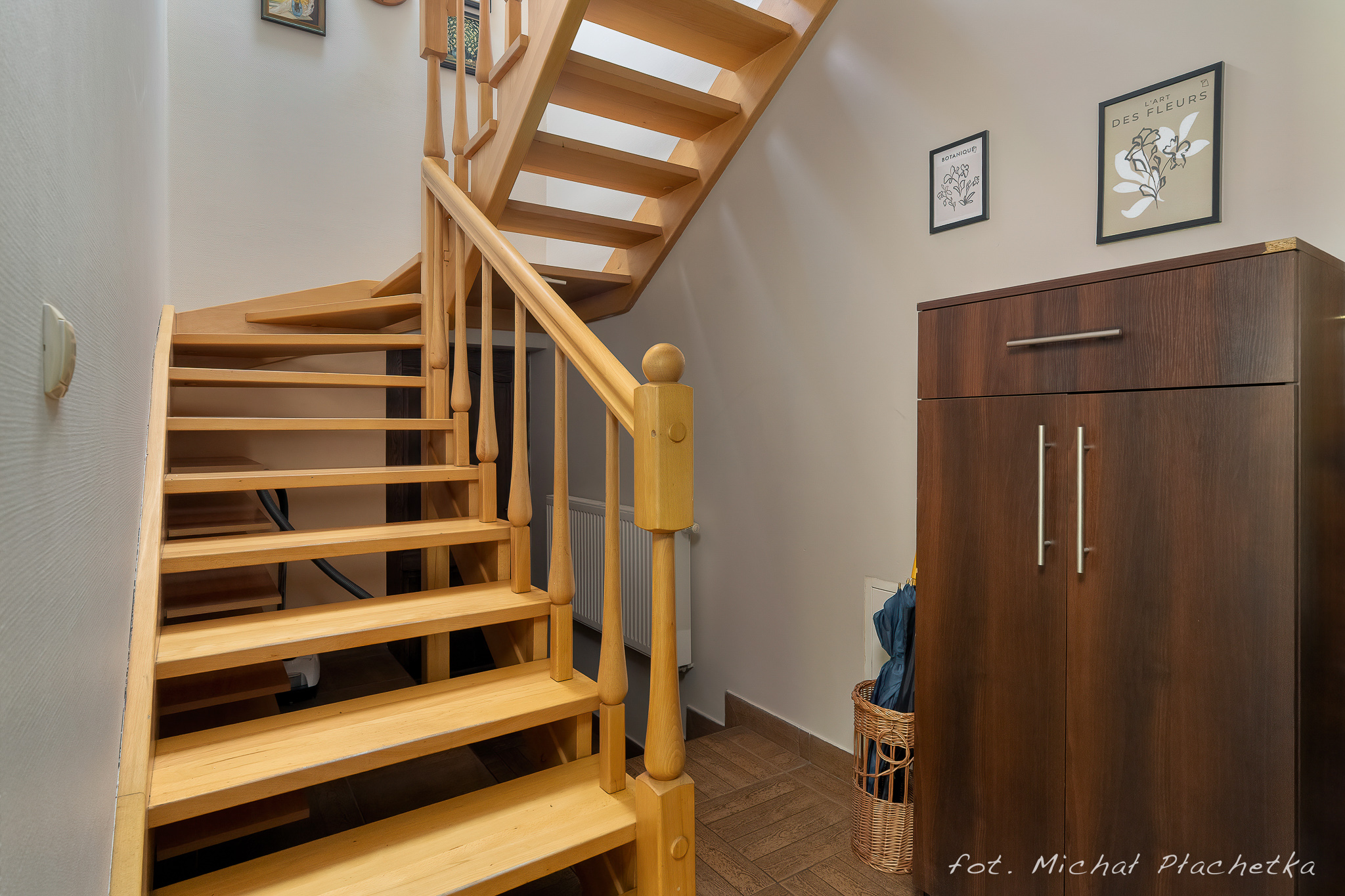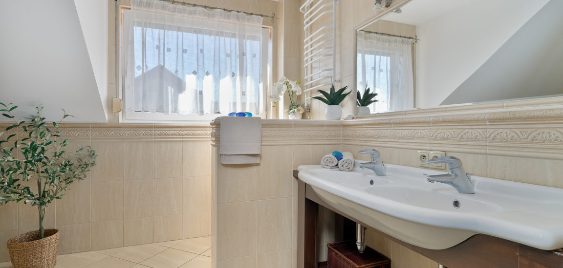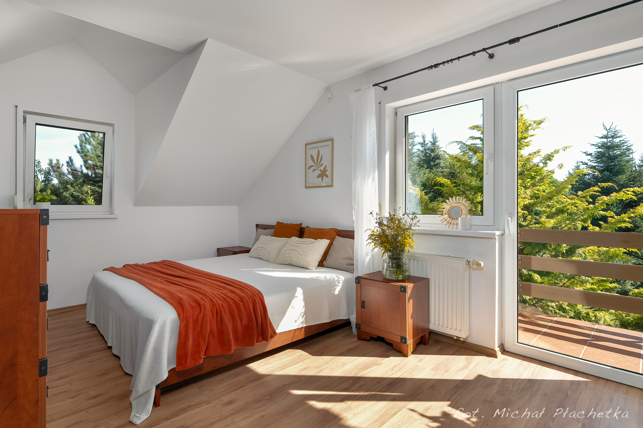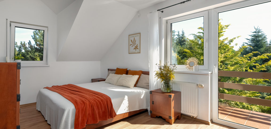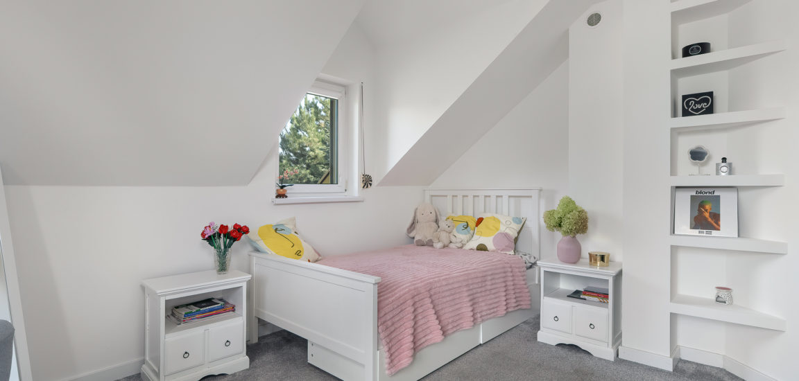 PIĘTRO: sypialnia, dwa pokoje, łazienka z prysznicem i dużą narożnikową wanną.