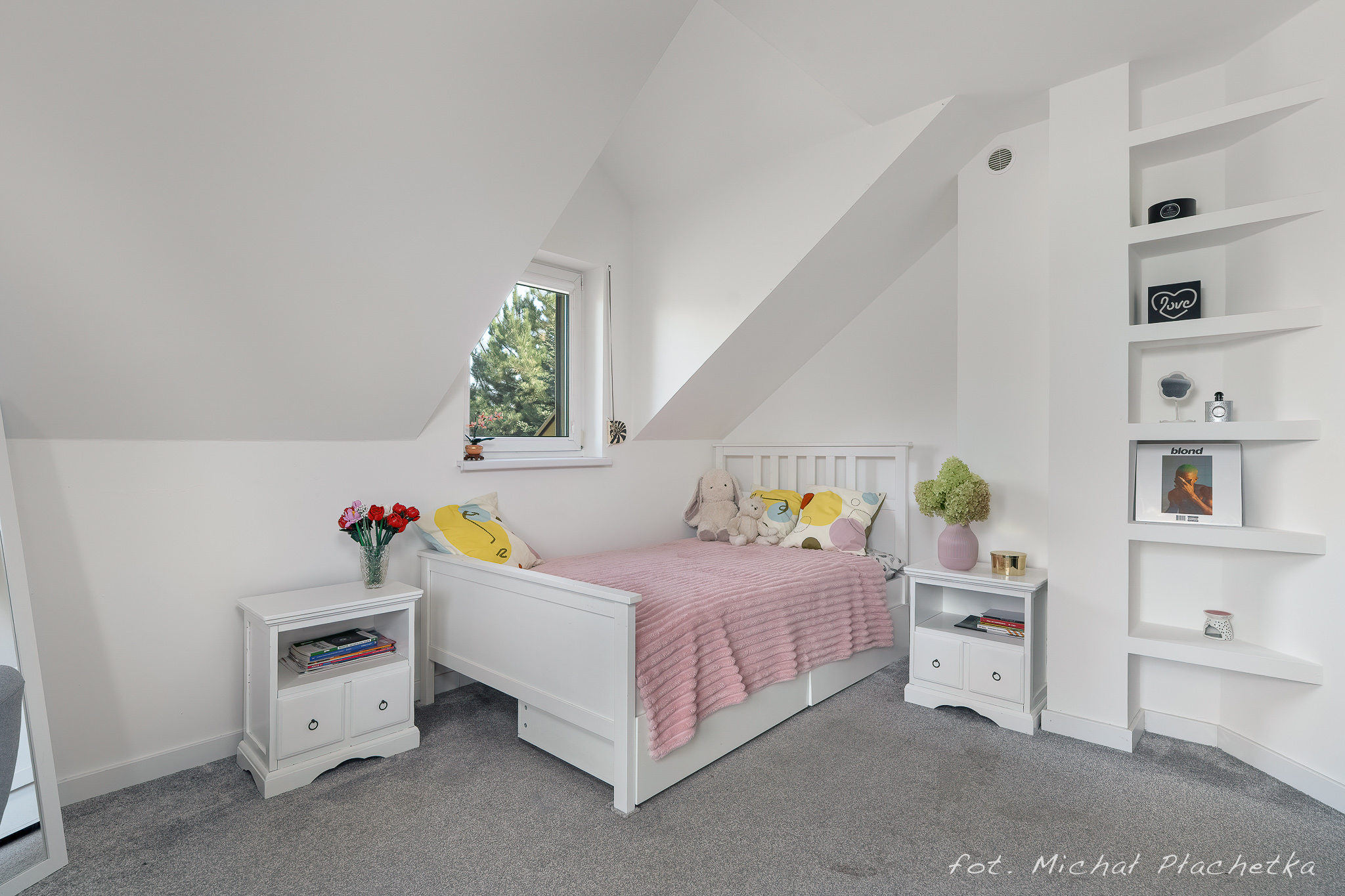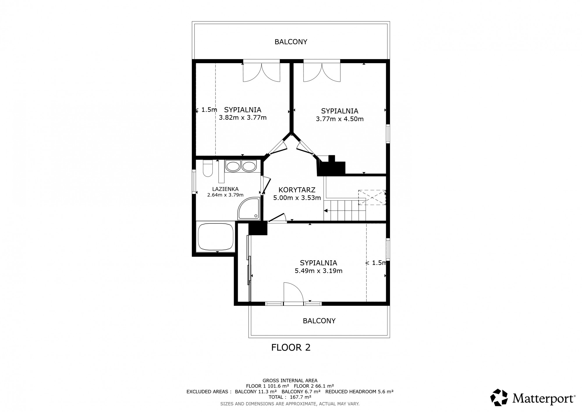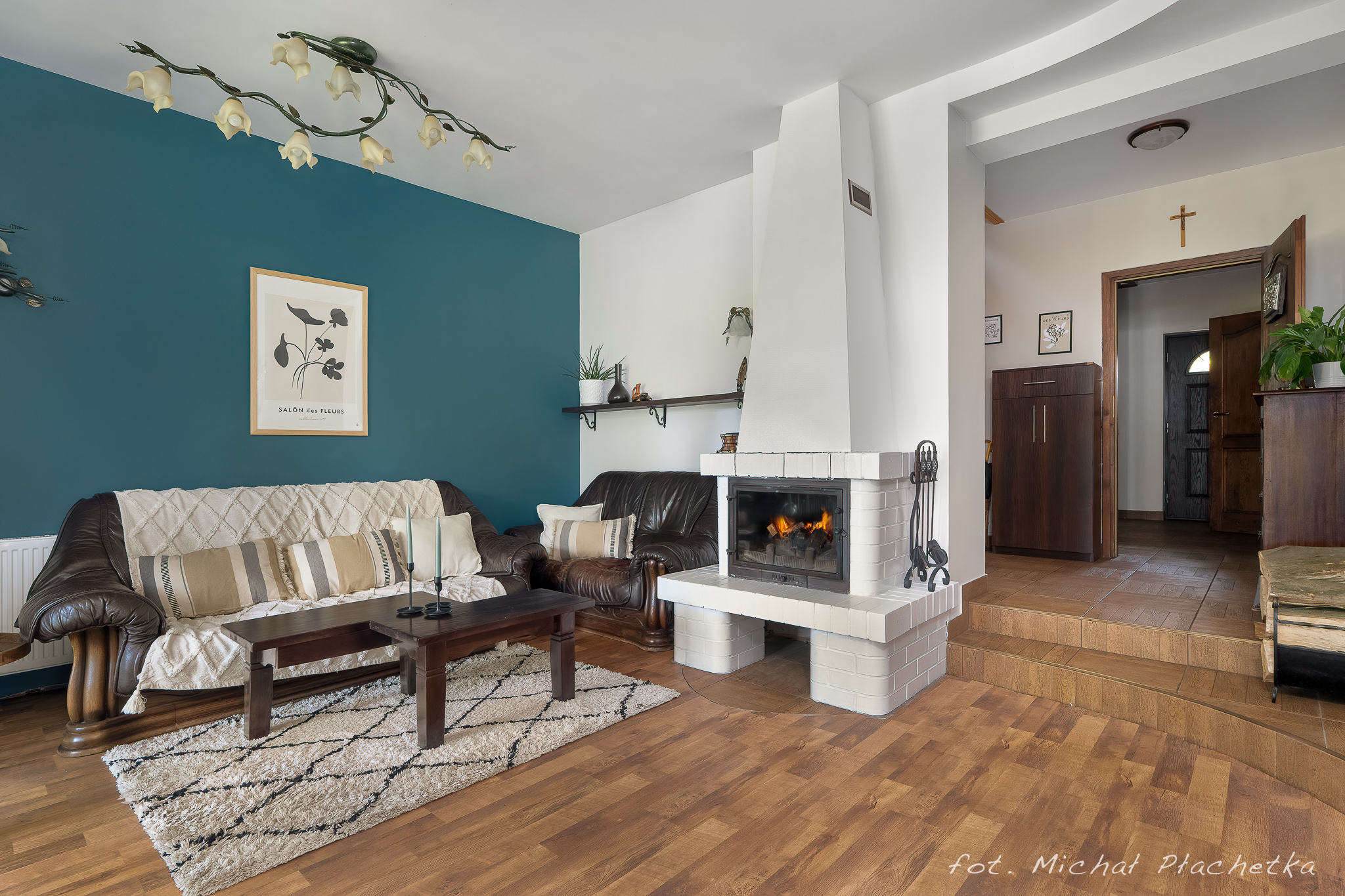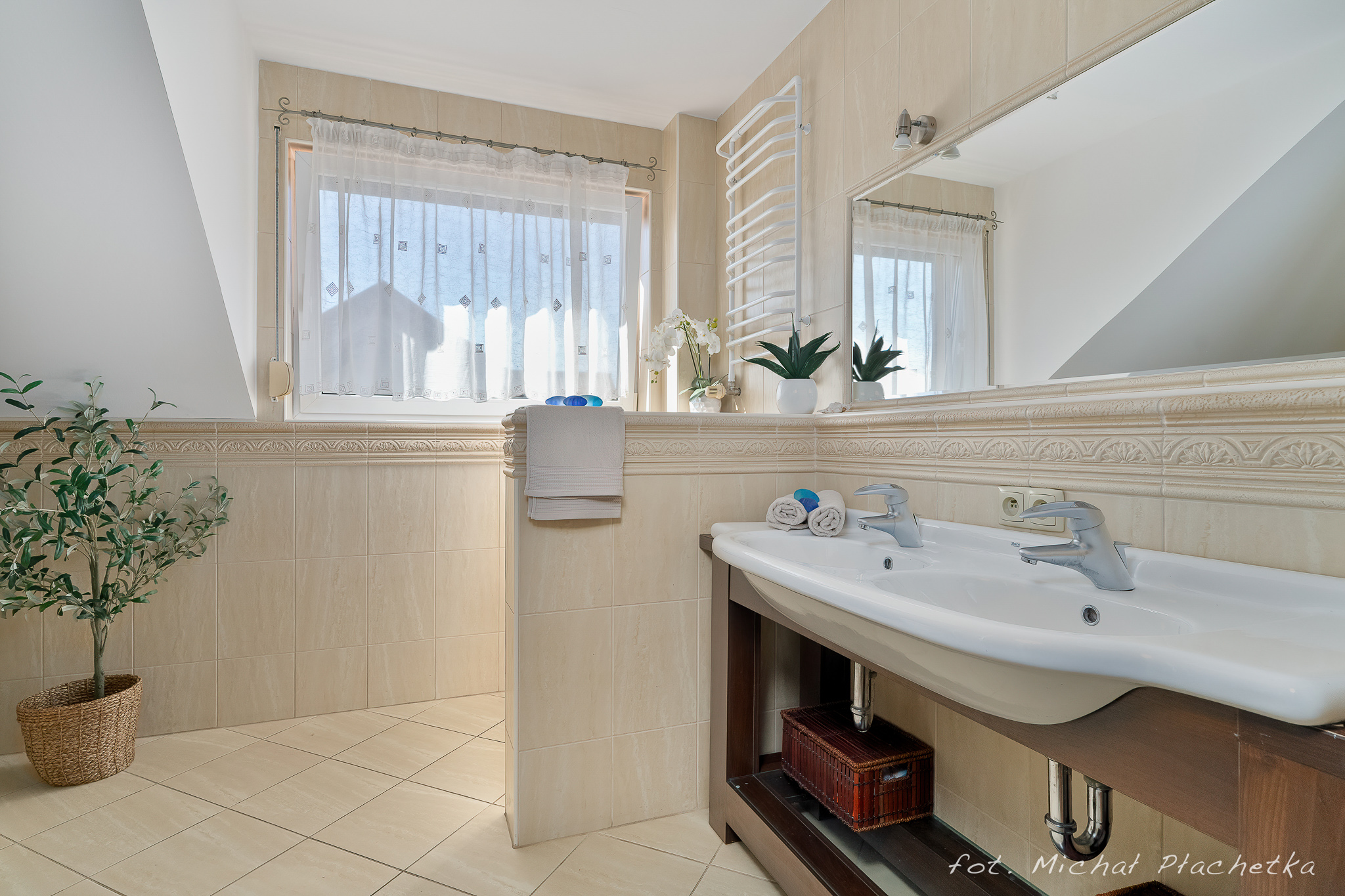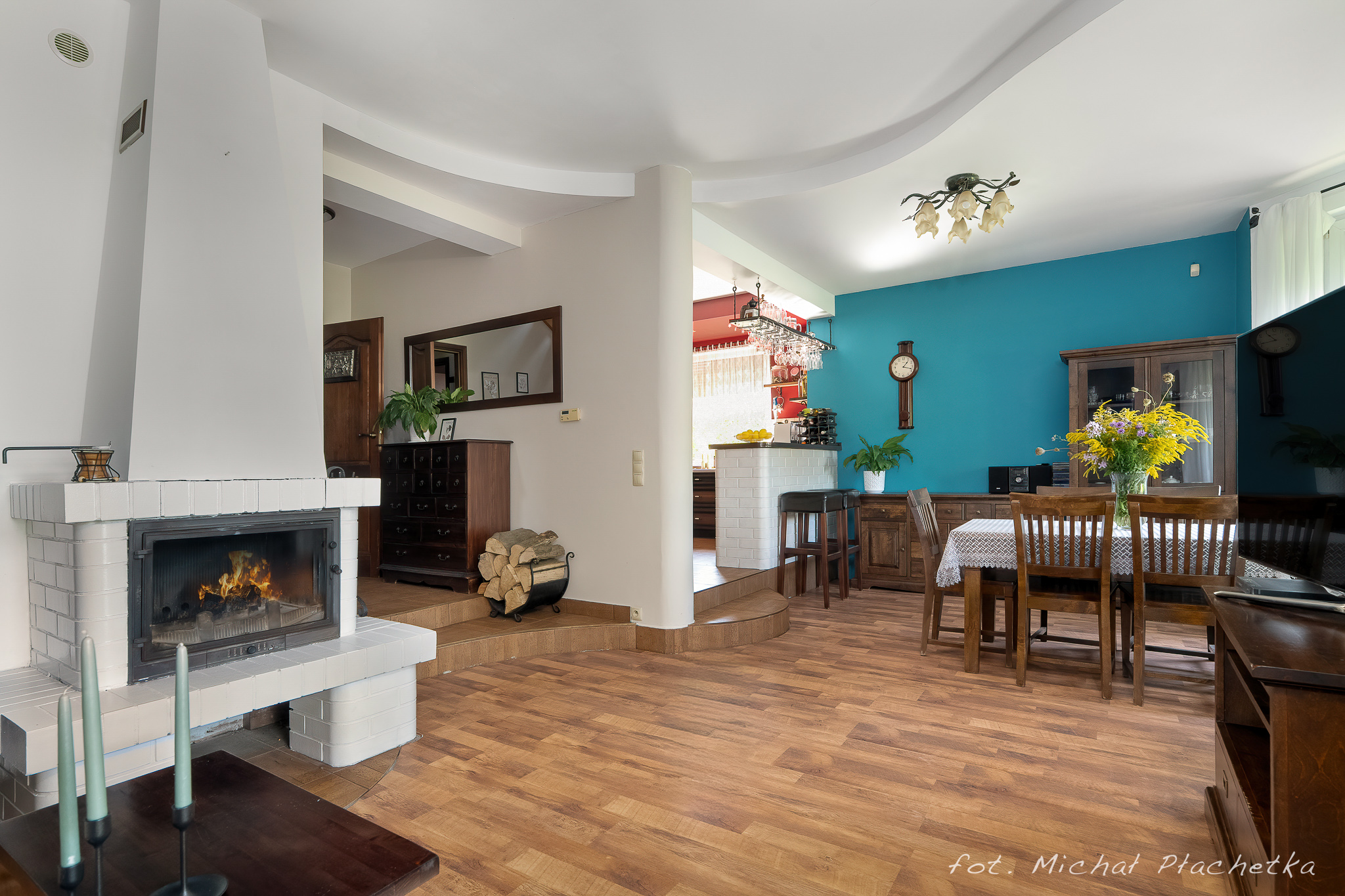 PIĘTRO: sypialnia, dwa pokoje, łazienka z prysznicem i dużą narożnikową wanną.