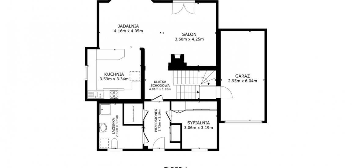 PARTER: salon z częścią jadalnianą, kuchnia, pokój (gabinet), łazienką, pralnia, wc, korytarz. Garaż.