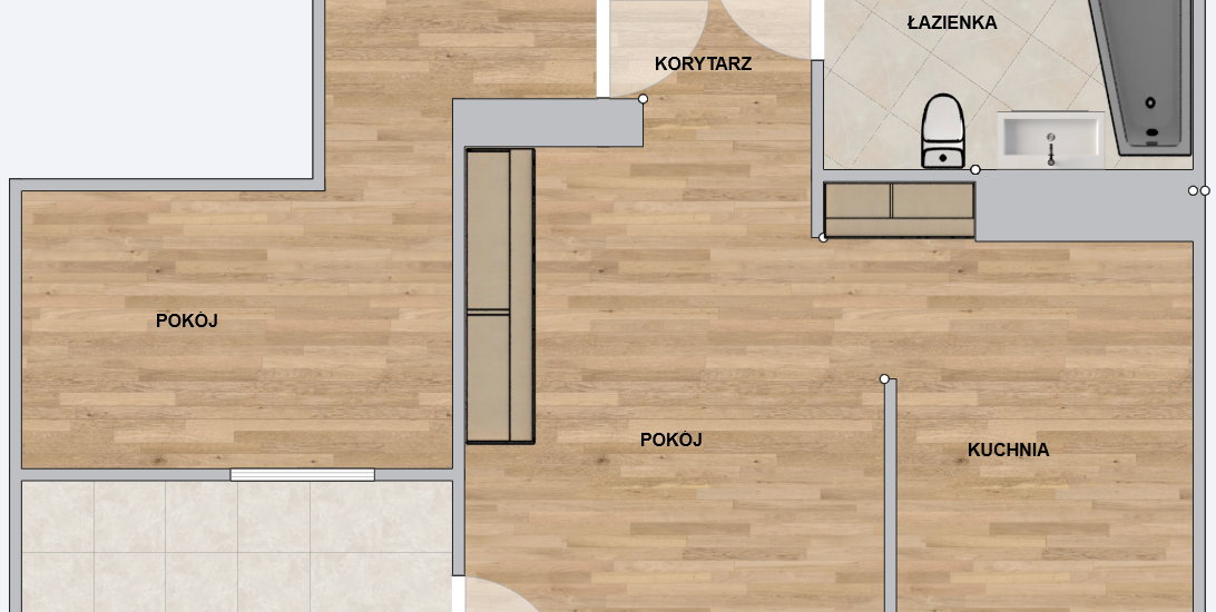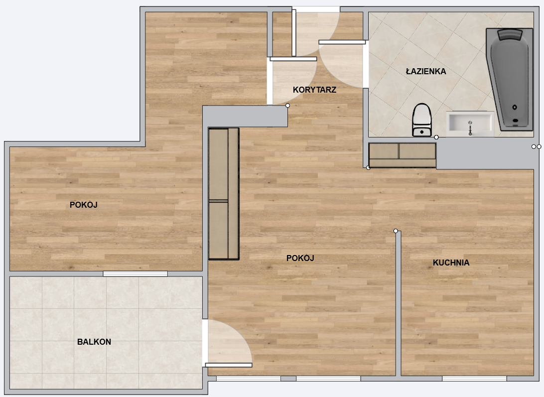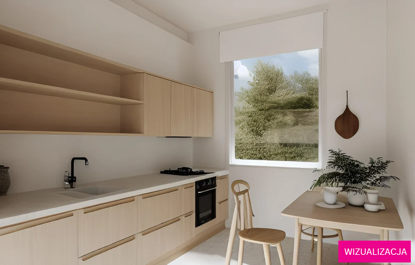 - oddzielna kuchnia (możliwość otwarcia na salon – lekka ścianka działowa),